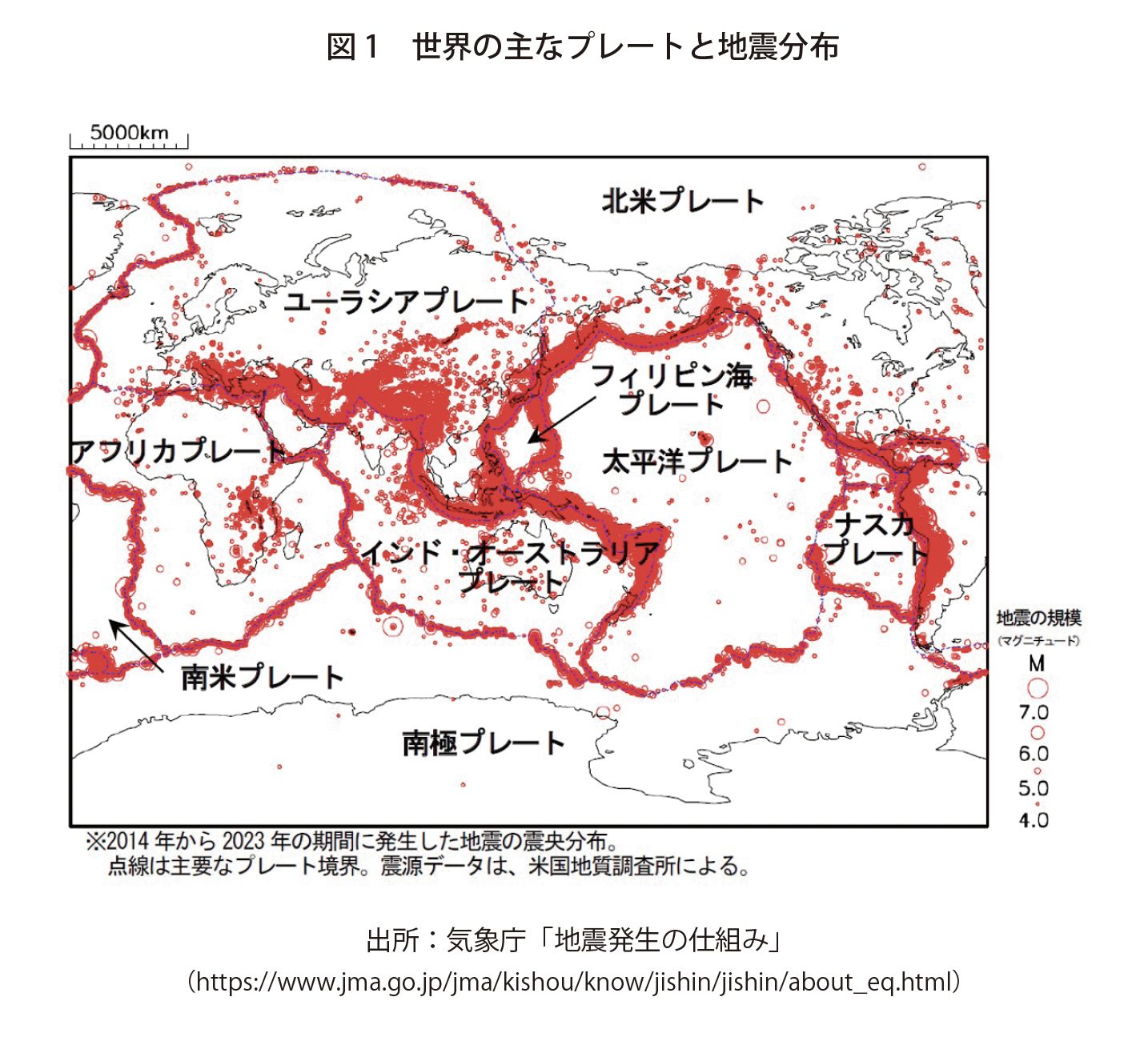 図1は世界の主なプレートと地震分布を示した地図である。赤い点が地震が起こる場所を示している。日本列島は北海道から沖縄まで赤い面になっている。これを見ても、日本列島全体がリスクにさらされているのは明らかだ。