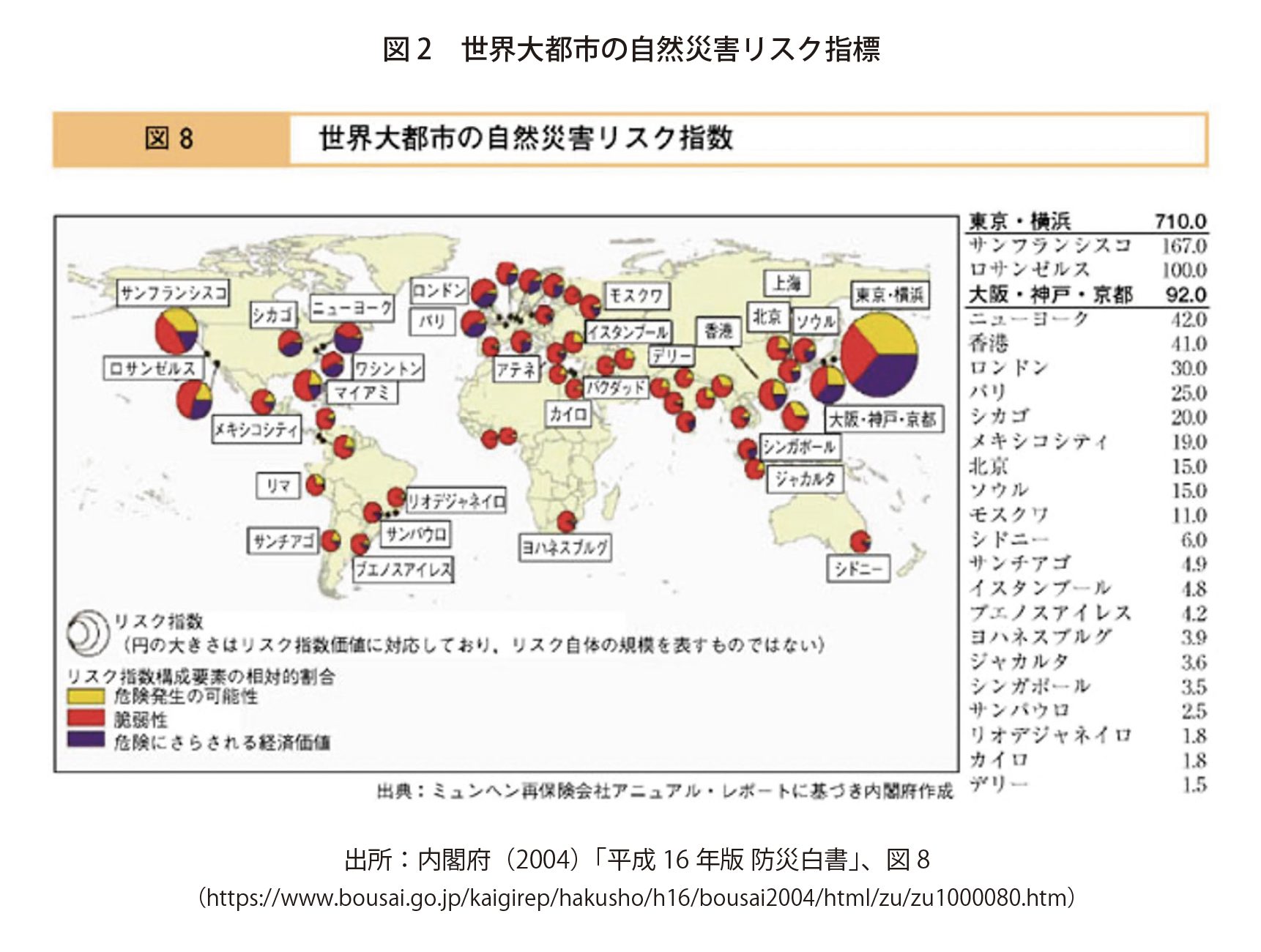 ドイツのミュンヘン再保険会社が世界の主要都市の自然災害リスク指標を算出している。図2はそれに基づき内閣府が作成したものである。これを見ると、東京・横浜地域が「710」という極めて高いリスクスコアを記録している。これは関西地域の「92」や、ニューヨーク、ロンドン、パリといった他の主要都市の2桁台のスコアと比べても圧倒的に高い数値であり、日本の首都圏が世界的に見ても非常に高いリスクを抱えていることを意味する。都市の高密度化やインフラの集中化が、この高リスクの背景にある。