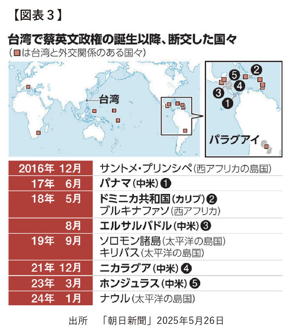 政治面では、中南米諸国と台湾との外交関係の切断を図ることも中国の対中南米外交における大きな目的であった。2016年に台湾で独立志向が強いとされる蔡英文政権が発足するや, 中国の動きが俄かに活発化した。中国は、パナマ、ドミニカ共和国、エルサルバドルに巨額の支援を約束し、その見返りとして各国は次々に台湾との外交を断絶させた(図表3参照)。