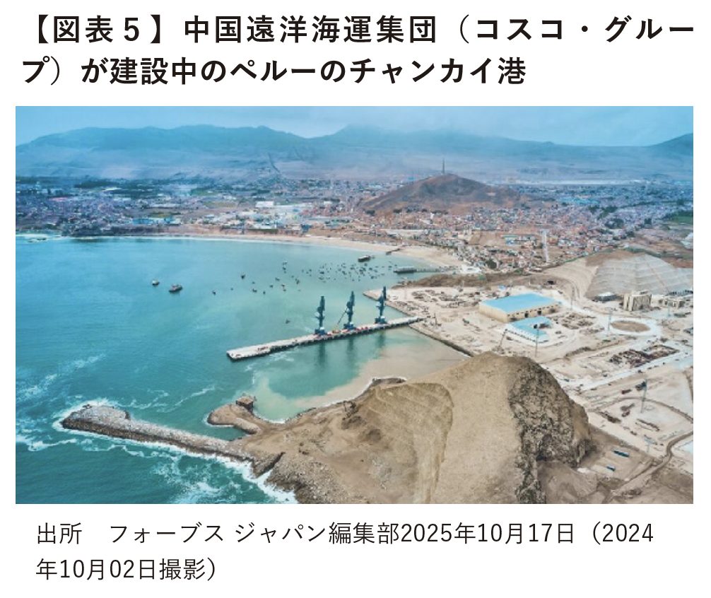 そのペルーに中国が接近、24年には太平洋に面するペルーのチャンカイ港が中国主導で整備された(図表5参照)。チャンカイ港湾施設は、南米の太平洋岸で最大。超大型コンテナ船なども接岸が可能で、中国による巨大経済圏構想「一帯一路」において中南米の中核となる戦略的にも重要な港だ。米軍が「有事には軍事利用の可能性もある」と警戒している。そのほかにも大型プロジェクトの計画も持ち上がっている。