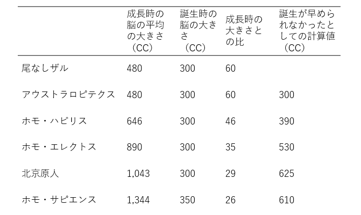 すでに述べたように類人猿とアウストラロピテクスでは脳は同じ大きさである(480㏄)。それが化石人類においてしだいに増大し、ホモ・サピエンスでは成長時の大きさは1344㏄と約3倍にまで増大している。ただし、留意すべきなのは誕生時の脳の大きさであり、誕生時では類人猿とホモ・サピエンスの違いはわずかなのである(300㏄と350㏄)。言い換えると類人猿では誕生時の脳の大きさは成熟した脳の60%に達するが、現在のヒトではそれがわずか26%に留まっている。すなわち、ヒトの新生児の脳の大きさは類人猿の新生児とほとんど変わらないが、類人猿では成熟すると約2倍となるのに対してヒトでは約4倍になるのである。